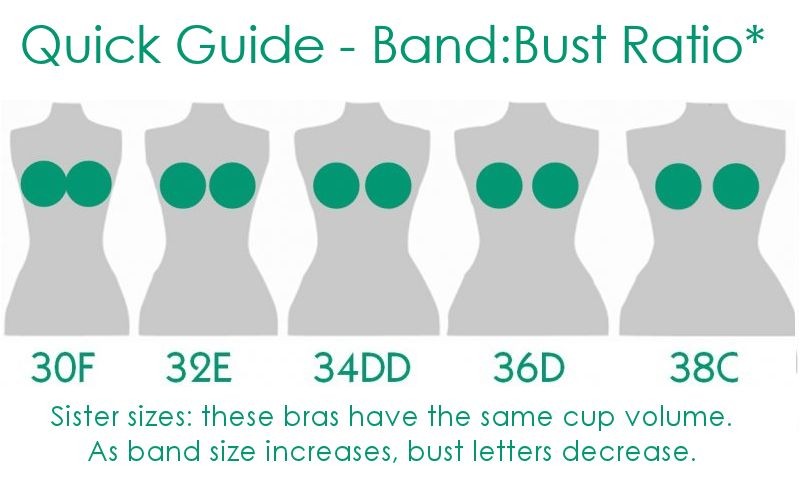 Let’s get the hard part over first-sister sizing. It seems easy at first. Just look at the diagonal boxes on the chart. You go up a band, and down a cup or vice versa. When you think harder about it, it starts to make less sense. Why does the band go down 2 inches but the cup only changes one size? This is because the cup size isn’t a measure of the volume of your breast tissue, but a measurement of the difference between your band size and the fullest part of your chest. Thus the band size changing on two people with the same tissue volume in the cup would yeild two different cup sizes.